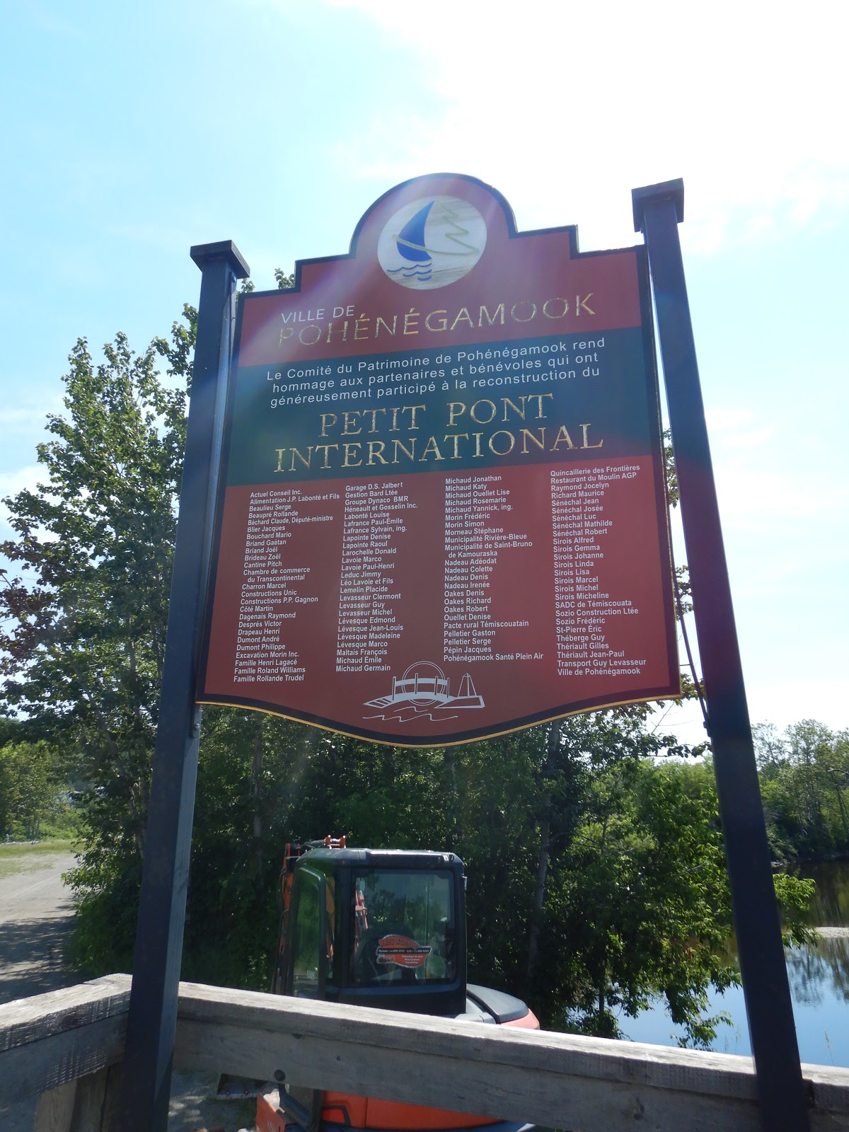 Our destination was the Parc de la Frontière. This tiny unguarded border has a foot bridge that was originally built around 1904 as a larger bridge to connect the Canadian towns of Pohénégamook and Estcourt. The original bridge inadvertently crossed the international border. Once the boundary was more clearly drawn, a new bridge was constructed wholly on the Canadian side, and the international bridge was reduced to a footbridge. That original bridge has since been destroyed by flood and rebuild. The current configuration is such that you can drive from Canada down a small access road into the little Parc de la Frontière , crossing into the US at the park’s border, and then walk across a pretty foot bridge, decked in flowers and flags, back into Canada. The lax border control reflects the fact that this little chunk of the US isn’t actually connected to anything else by road. There is a customs station down the street, and presumably a more rigorous check if you take the road in the other direction into the US.